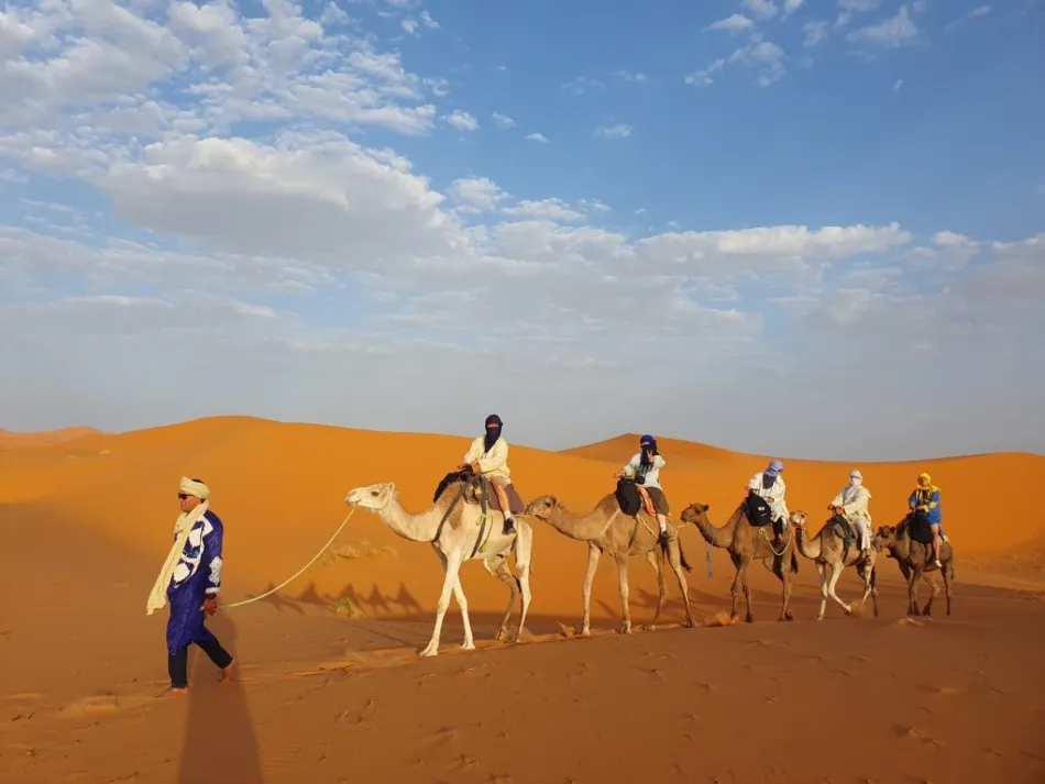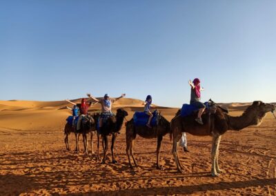 Begin your adventure at our Hassilabied base, where you’ll meet your camel and expert guide. After a short briefing on camel riding, set off into the desert. Ride across the undulating dunes, following trails that lead you deeper into the heart of Merzouga. Pause along the way to enjoy the vast desert scenery and capture breathtaking photos. Arrive at your desert camp in time to witness a stunning Sahara sunset. Enjoy a traditional Moroccan dinner and sip mint tea around a warm campfire before settling into your comfortable Berber tent for the night.