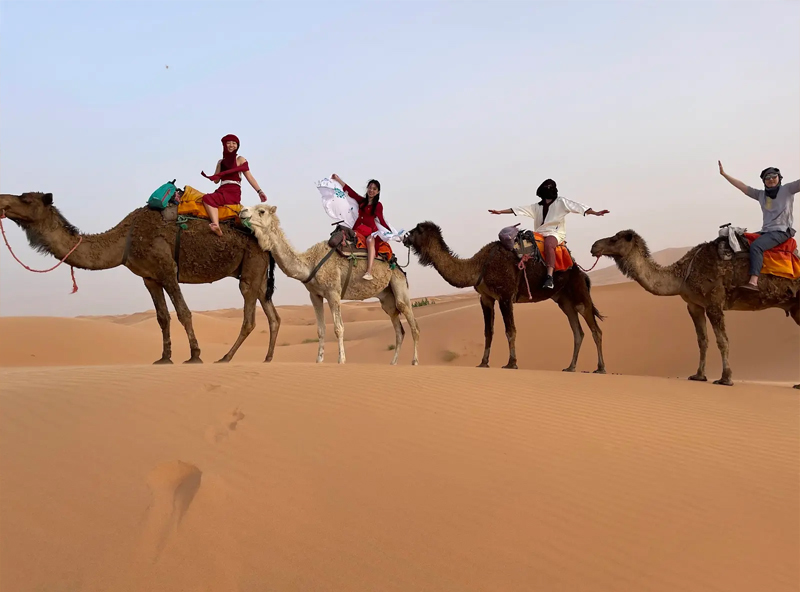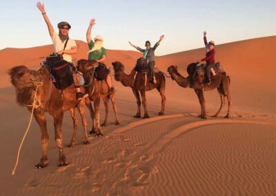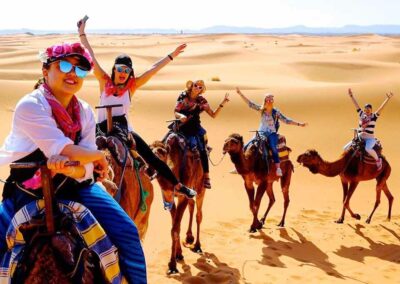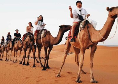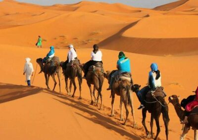 Set off along winding desert trails, feeling the gentle sway of the camel as it climbs dunes and crosses desert plains. The extended trek allows you to reach more remote areas of Merzouga, where the dunes stretch endlessly, and the silence of the desert is truly mesmerizing. Your guide will share stories about nomadic life, desert survival skills, and the cultural heritage of this timeless land. Take breaks to enjoy panoramic views, watch the light play across the sand, and capture perfect photos of your journey.